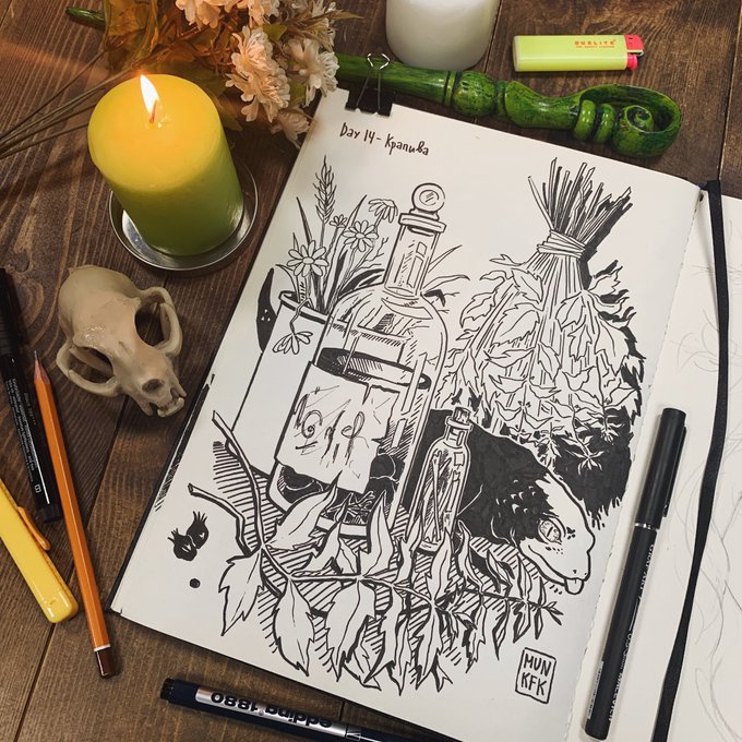 day 14 - nettle🦎 (день 14 - крапива) #slavicwitches_inktober #russianwitches_inktober #inktober #inktober2022 #inktoberday14 #ink #alchemy #myphology #traditionalart #art