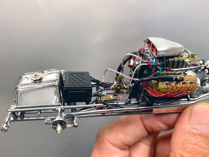 #All_That_Competition_Car シャーシー形になってきました 電装ケーブルやらオイルホースも追加 パーツ点数もそれ程多くないキットですが手持ちの材料で出来るだけ雰囲気アップしてます