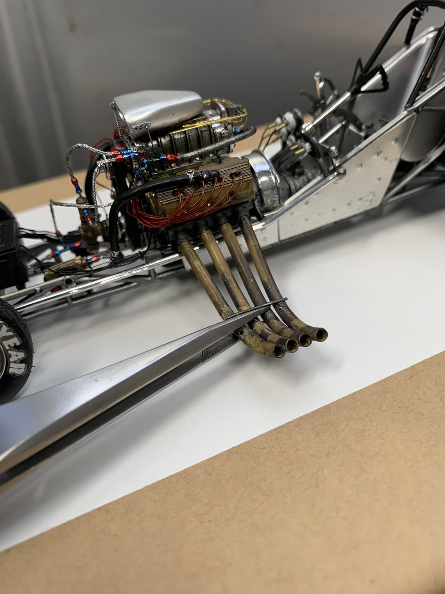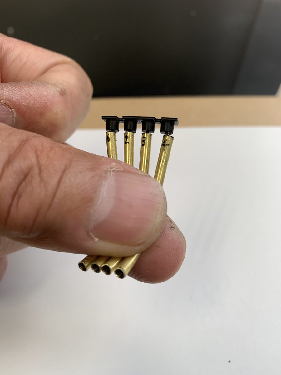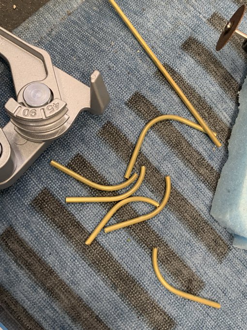 エキゾーストパイプを真鍮管で作ってみました。 ボディーサイドから突き出した排気管は見せ場の一つなんですけど付属パーツは一体成形でイマイチショボいので😢 パイプベンダーで曲げ長さを揃えてバーナーで焼き入れました #ムーンアイズファニーカー #All_That_Competition_Car