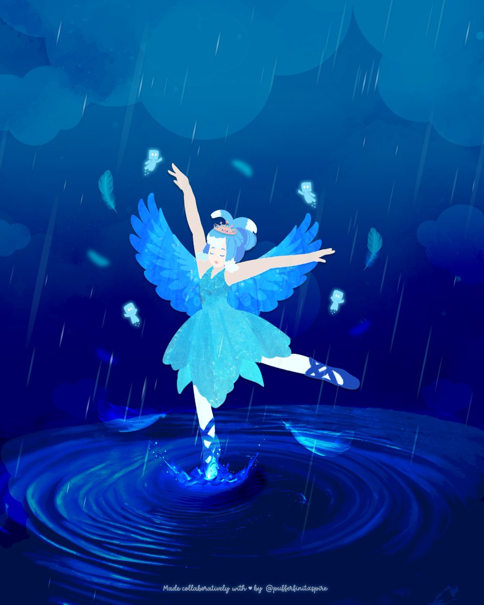 #Inktober2022 Day 24 + #HOLOctober Day 3 & Day 30: Angelic ballerina surrounded by the allays beyond the raindrops and dances together (ehe~)🧚♀️☔🌧🩰 #KoboKanaeru #AeruSeni ☔ #allay