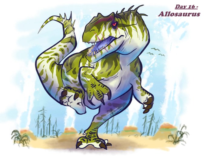 Day 16 - Allosaurus ~ A large theropod dinosaur that inhabited North America, Europe , and Africa during the Late Jurassic. A large, powerful predator, it would have competed with other carnivores like Torvosaurus and Ceratosaurus. #paleoart #allosaurus #JurassicWorld