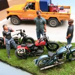 実は左側の白ハーレーが配置されている所にはBSAが置かれる予定でした。しかし直前に事故があり選手交代しています。 男性2人は前作のコルセア情景に登場したカスタムバイクショップの兄さんです。 #スケールアヴィエーション #AlternativeModelingGarage #35motors