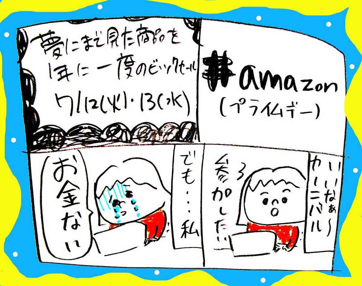 【#amazonプライムデー】 amazonが7月12日~13日にカーニバルをするらしい。 いろんな商品が安くなるというのに・・・ 私、参加したくてもお金が無い。泣く😭 欲しいのもがあっても、毎回買えない。我慢。 #プライムデー #漫画が読めるハッシュタグ #コミックエッセイ