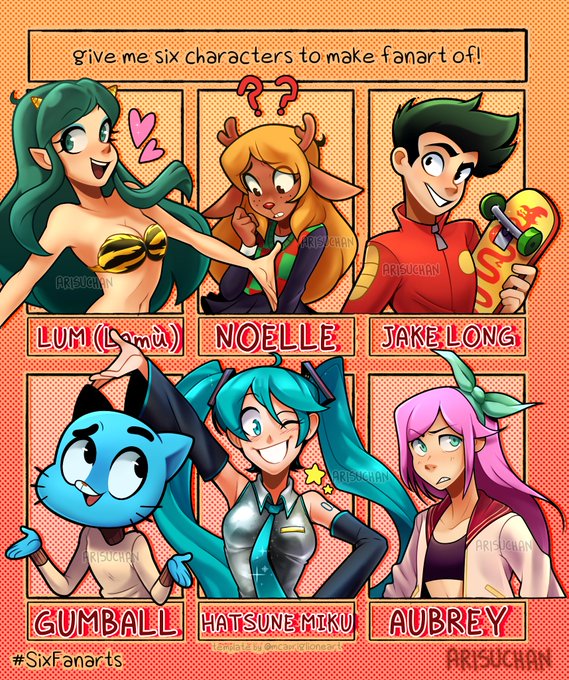 My fourth #SixFanarts challenge!! #uruseiyatsura #deltarune #americandragon #tawog #gumball #hatsunemiku #omori
