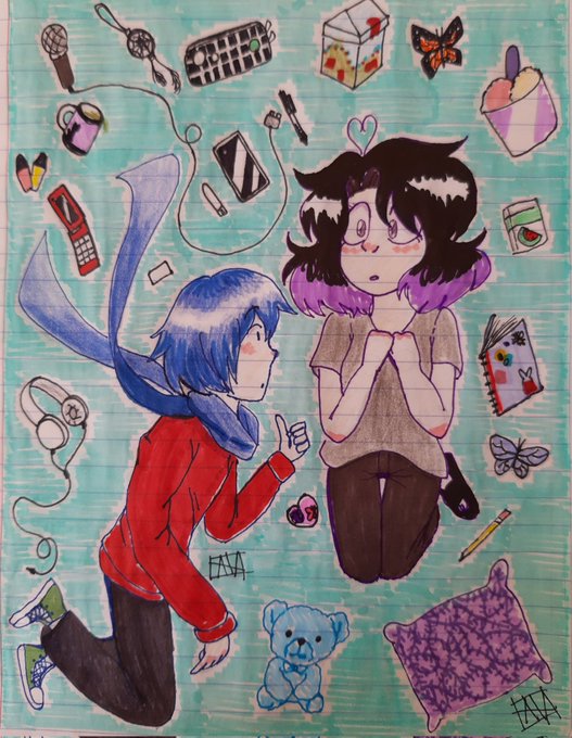 Día 19 - 20: Flotar ♡•~•♡•~•♡ Hey!! Hola!!✨🖤 quería dibujar a Kaito junto a mi oc Al rededor puse cosas de él y mías que uso muy seguido o son importantes para mí, espero les guste ( ╹▽╹ ) ✨🖤 #draw #drawing #Inktober #AmiVisual #inktober2021 #originalcharacter