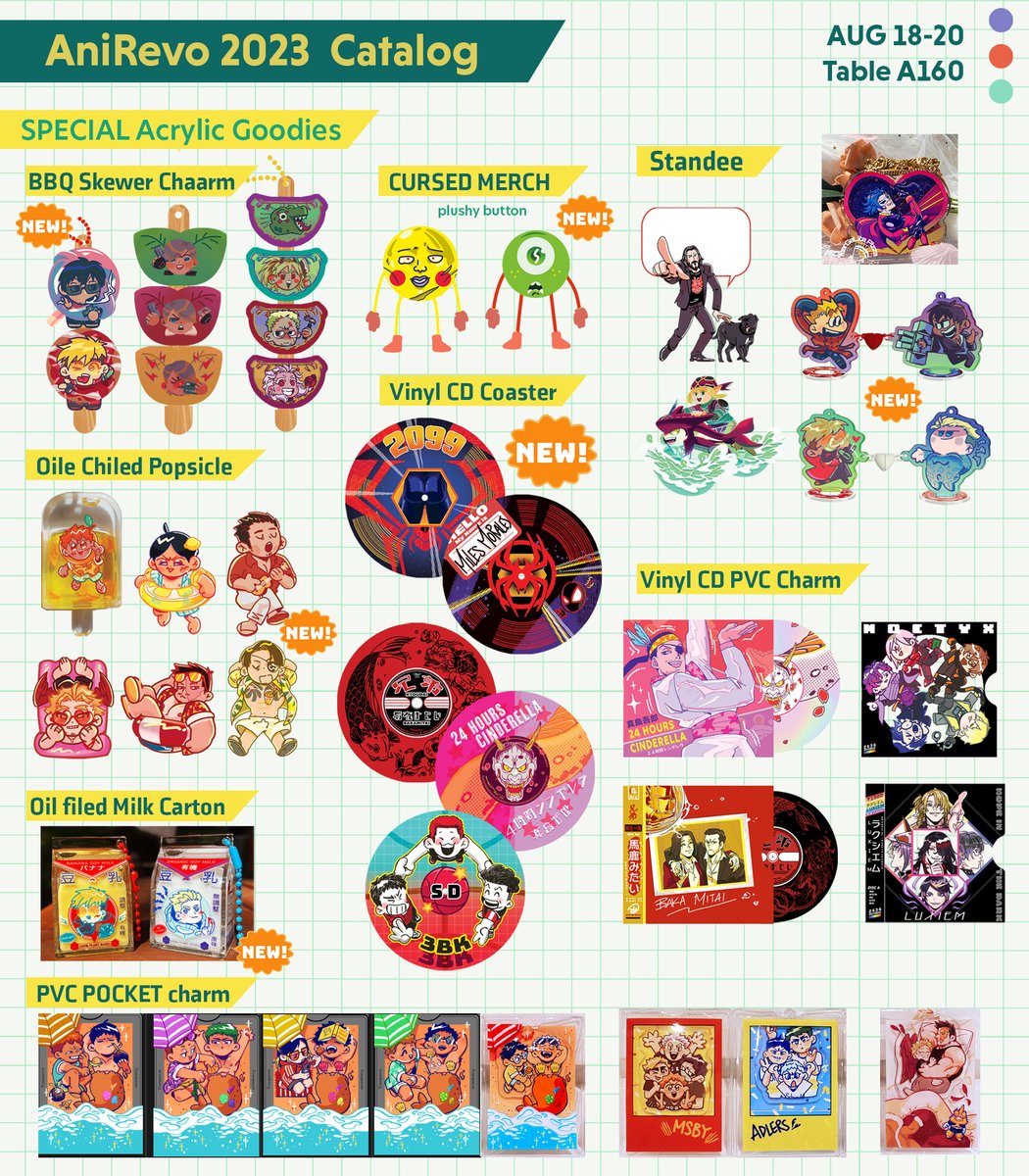 My full catalog for #ANIREVO this weekend, I accidently made too many new stuff and now i got too many goodies 🥹😂 Come out and say hi if you are going this weekend! my Table is at a160 with AD, map and location👇 #AnimeRevolution @anirevo2023