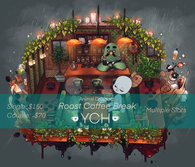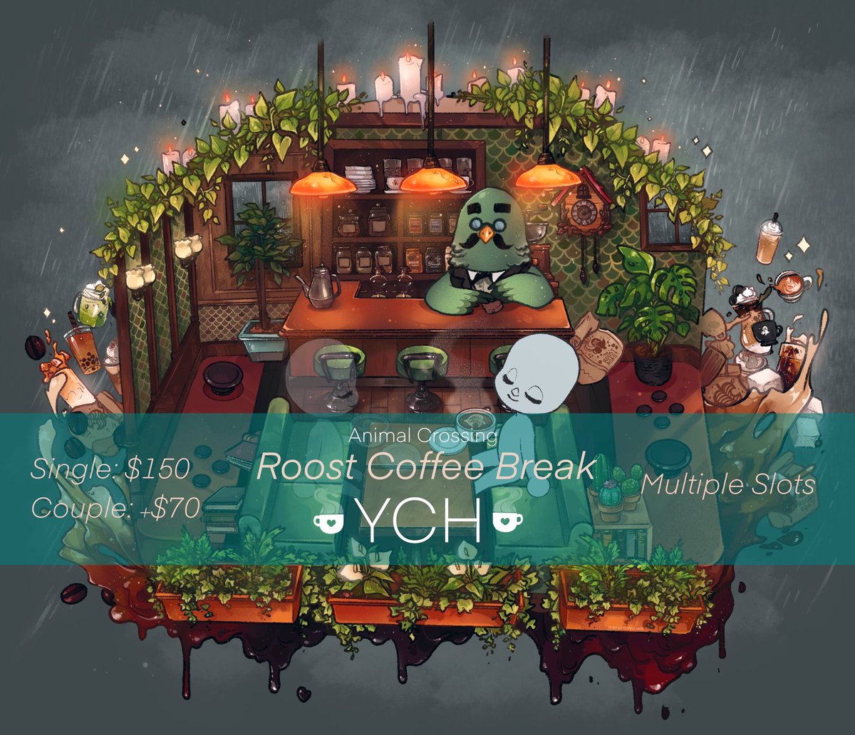 🐦🌧 RAINY ROOST CAFÉ YCH 🌧🐦 ☕️ 150 Single • +70 for a couple ☕️ Multiple Slots ☕️ Human & Anthro characters welcome ☕️ Will close if/when enough requests are posted COMMENT ‘CLAIM’ BELOW FOR A SLOT 🖤 R/Ts are very appreciated! 🖤 #AnimalCrossingNewHorizions #ACNH