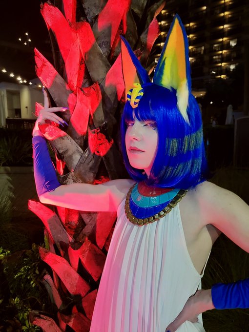 Worship me, peon~ 🐱💙💛 📷: @_novafilm_ Wig: @stumpyroot Ears and tail: @_aquariusgarden 🍑: @ThePeachyCo_ #Ankha #AnimalCrossing