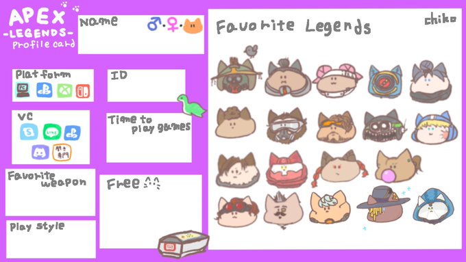 アッシュねこ追加しました! またまた作るの遅すぎるかも知れませんが更新ついでに使ってもらえると嬉しいです🐈⬛🐈 追加して欲しい色あればお気軽に│˶˙ᵕ˙˶)꜆ #Apex自己紹介カード #Apex自己紹介カードテンプレ #Apex募集pc #Apexフレンド募集ps4 #APEX #チコのお絵かき