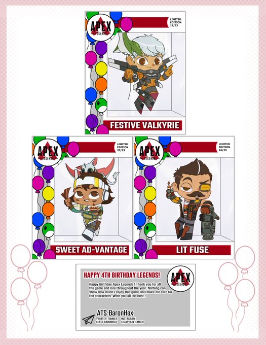 🎂Haapppy Birthday Apex Legends!🎂 The community has come to celebrate Apex's 4th birthday with a special zine: 🎈Balloon Drop! An Apex Legends Birthday Celebration Fan Zine! Check out the tag to see everyones work: #ApexBalloonDrop ⬇️Link to the zine & more in replies!⬇️