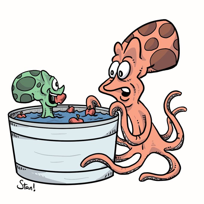 I did my Day 28 OCTOber drawing a little earlier in the day than usual. Bobbing for apples is fun and challenging no matter WHICH side of the surface you're bobbing from. #octobrrr #drawlloween #inktober #octopus #halloween #apples