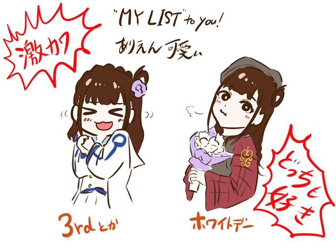 ライブで1番衝撃的だった振り(?) マイリスの「“MY LIST”...偉そうかな?」の後の愛奈ちゃんの「😆」って表情が可愛くてめちゃくちゃ好きで今回も楽しみにしてたんだけど、いつもと違う顔されてでもそれもすごく良くて不意打ちで死ぬかと思った #Aqoursとホワイトデー_Day2