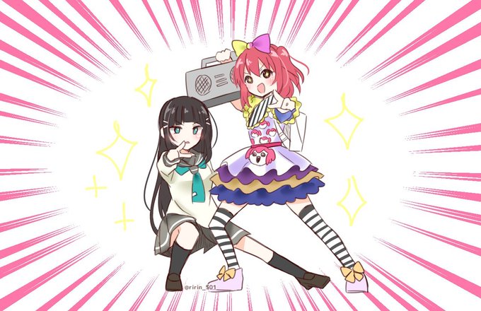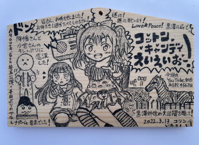 今日、内浦の淡島神社に絵馬奉納しました。3/5.6に開催されたAqours.6th。 DAY2にて初披露された黒澤ルビィ曲『コットンキャンディえいえいおー!』があまりにも衝撃的だったので、ノリノリで歌う降幡さんと黒子役に徹する小宮さんを描きました(・∀・) #lovelive #Aqours #Aqours_SUNNY_Day2