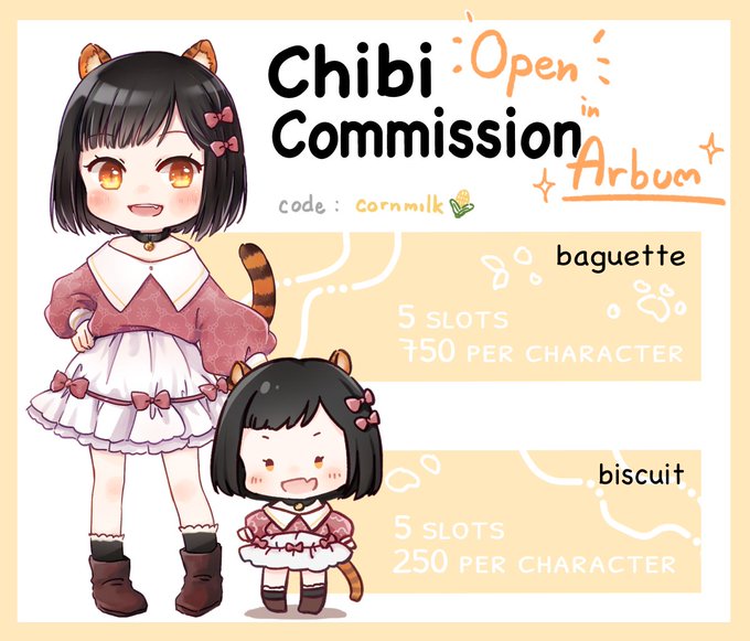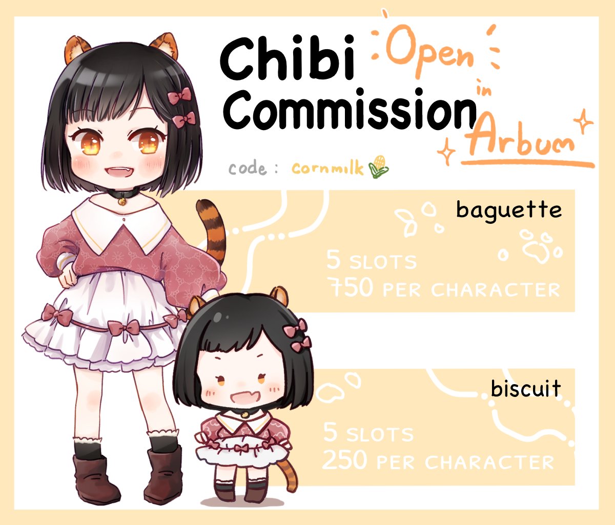 🌱Chibi Commision OPEN🌱 เปิดคอมมิชชั่นจิบิ 2 ไทป์ ไทป์ละ 5 คิวในอาบั้มค่ะ 🍪Biscuit Type: arbum.art/a/01829196-84f… 🥖Baguette Type: arbum.art/a/018291a4-ef0… ด้วยพลังนมข้าวโพด ถ้ายอดถึง 1,000 ใช้โค้ด cornmilk จะได้ส่วนลด 100 นะคะ🌽✨ #commissionTH #arbum