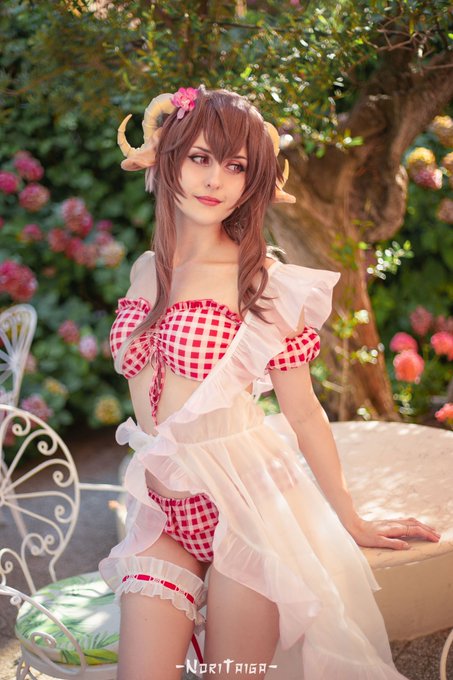 Channeling the summer vibes with this lovely photo by @NoriTaigaCos from last year 🩷🌺🐏🌊 Costume by @uwowocosplay (code “betwin” for a discount) #arknights #arknightscosplay #明日方舟 #アークナイツ #コスプレ #eyjafjalla #cosplay