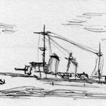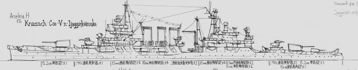 #架空艦 #Arseleia_H #イラスト 名称 Knazach-Cœ-V-n-Ijaggorkéinsoka(ナザフ クァエ ヴァン ノット ヤゴルキンソカ) 飛翔誘装巡洋艦 主砲 15.2cm連装砲 2基 対空 10cm連装高角砲 1基 →