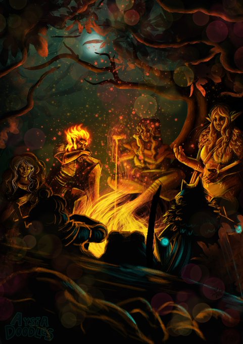 My submission for @ArtClubIE ‘s Campfire prompt! I wanted to challenge myself a bit and do a multi-character scene so I drew my D&D Party, discussing tactics and enjoying the warmth of a cozy campfire on their journey into the Swamp. Hope ya like it! #artclubie #dndart