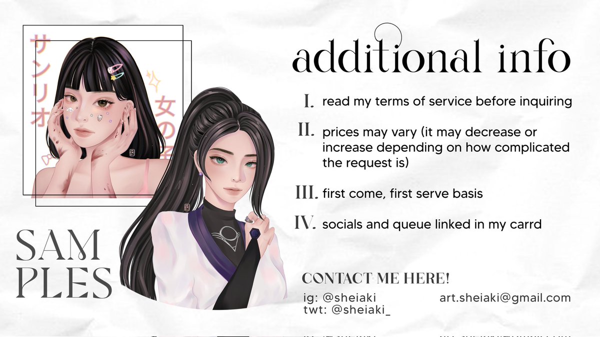 Takomms Open !! Finally had the motivation to finish my commission sheet. For questions and inquiries, you may DM or email me [💌] #commissionopen #commissions #commissionart #artph #arttwt #commstwt #artcommissions