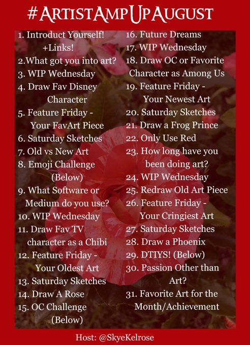 #ArtistAmpUpAugust list is HERE!😃 I've narrowed it down a bit, tried to make it a bit less overwhelming and more specific! Also added in some fun challenges! Which I'll put more info on below! #artistsontwitter #artists #art #artprompts