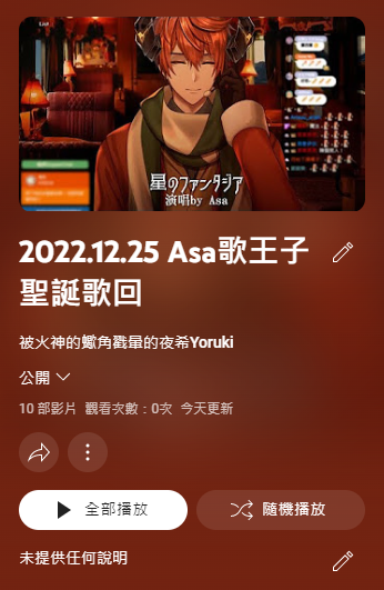 #Asalive #ArtforAsa 終於把歌王子聖誕歌回的唱歌部分剪好了~ 我建一個播放清單方便大家循環播放,除了夢追人へのSymphony之外,其他每一首都有在裡面~ 播放清單的連結在這邊↓ youtube.com/playlist?list=…