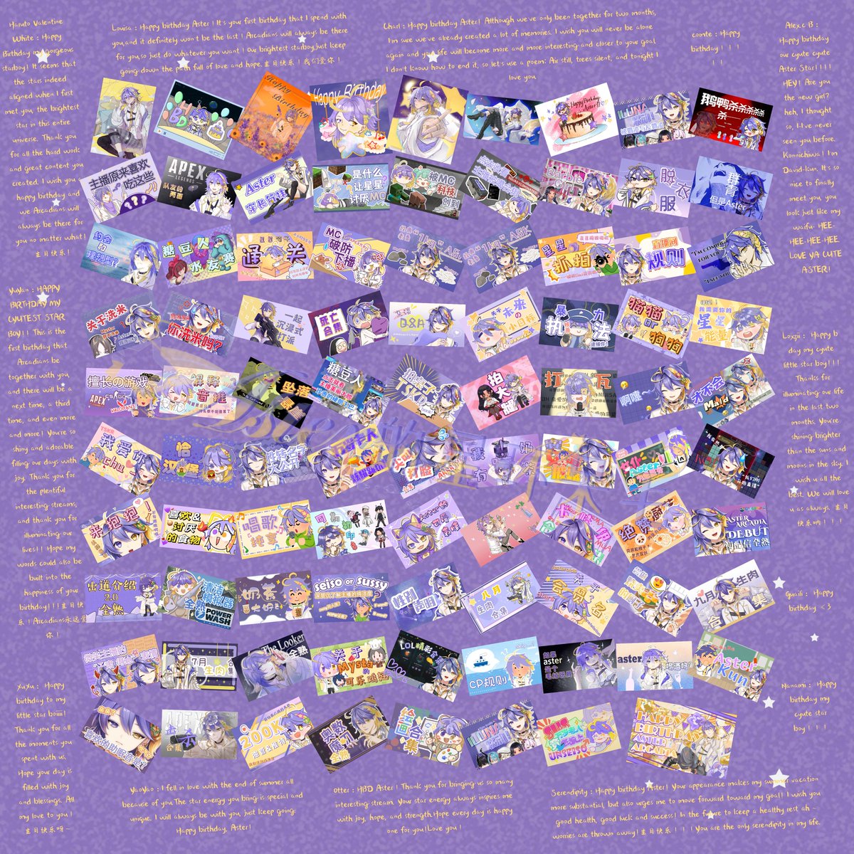 💜12:00AM💜(END) #Arcadiart #AsterStarday2022 The final post for #Aster2022Bday24hCelebration is the compilation of celebration arts, our clips' thumbnails, and the bday messages written by our group members!🥳🥳🥳 Much love for our brightest star in the universe!