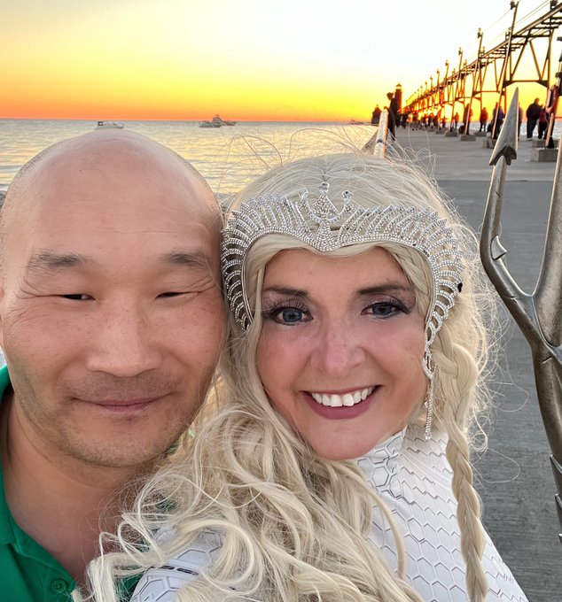 It’s been a while since I posted a #photographerfriday photo. Here is @FEdgePhoto with me in Grand Haven, MI, waiting for the sunset to shoot more #Atlanna. I’m soaking wet from shooting at the end of the pier, so no idea why I’m smiling so much. Must be the company. #cosplay