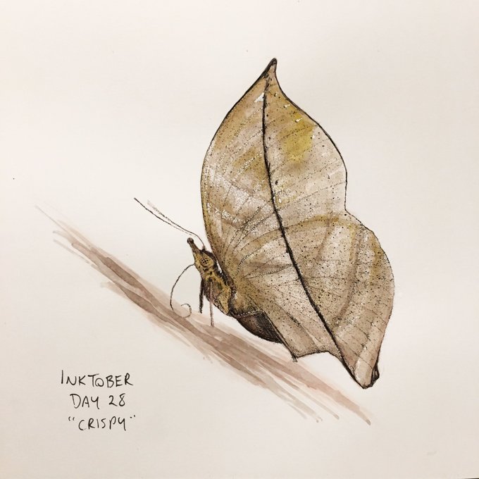 #inktober Day 28: “crispy”. I thought about doing something with “crisp” autumn leaves. Then I decided to do a leaf insect, which I assume is also crispy... Did it fool you? Did you think it was a leaf??? . . . #inktober2021 #crispy #insects #Autumnwatch #bugs #InkDrawing