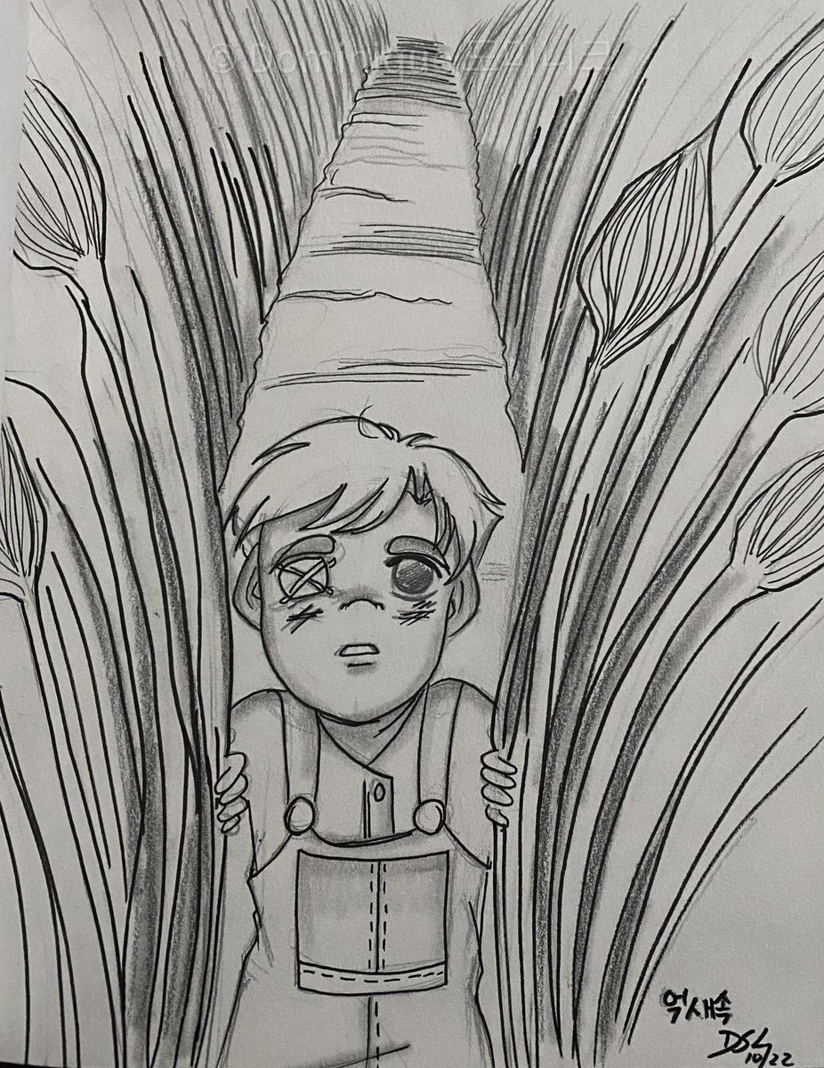 #BAInktober #inktober2022 day 10 silver grass 억새속 Ok I had a whole story about this kid. ALIENS. He’s a little farm boy and noticed something strange in the silver grass and peers thru and finds something sinister! Also silver grass is very pretty. The 1 I saw looks like this