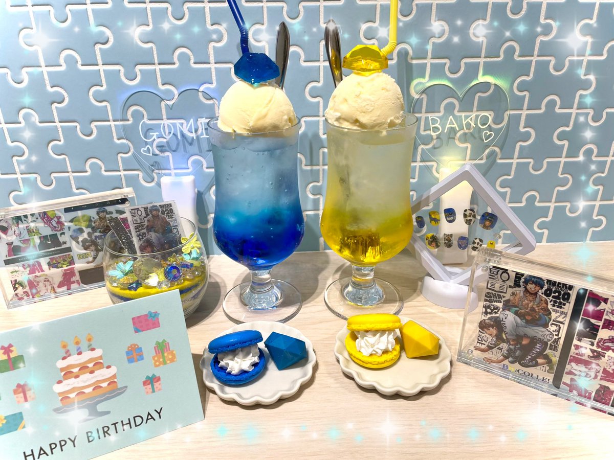 仲良し夫夫まとめてになりますが、2人にピッタリなクリームソーダでお祝いしました💙💛💎✨ ごみばこちゃんお誕生日おめでとう🥳🎂いつまでもラブラブで🫶💕 #BBiコレ #BBi誕 #ごみばこ #BBiコレファンアート #五味光輝爆誕祭2022 6/11 #箱崎大亜爆誕祭2022 7/12 #ノビノニウム 先生