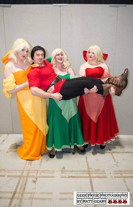 No one gets carried like Gaston. Photos: Geek Pride Photography The Bimbettes: Dirtymosher_KT, Kyokyo Cosplays & AliceRoseSews #Cosplay #Cosplayers #disney #beautyandthebeast #disneysbeautyandthebeast #gaston #disneycosplay #photooftheday #me #fitness #photo