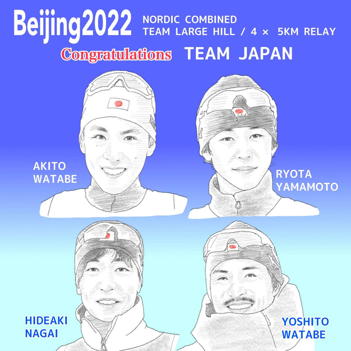 日本チーム、おめでとう🎉🥉🎉 #渡部暁斗 #山本涼太 #渡部善斗 #永井秀昭 #北京2022オリンピック #Beijing2022 #ノルディック複合団体ラージヒル/4×5km #落書き #イラスト #遅くなったけどやっとメダリスト全員を描いた(はず)