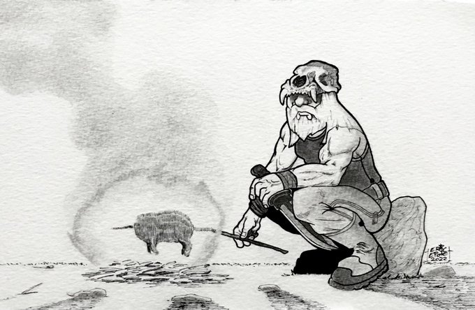 27. SNACK 🍖 "Hunter Mitt", main villain of #BabyBobBear Seen here roasting a guinea pig similar to Ponytail and wearing the skull of Bob's father as a hat. Last human alive, a piece of sh*t Full bio on IG #inktober #drawingchallenge #carnivorediet #illustration #sketchbook