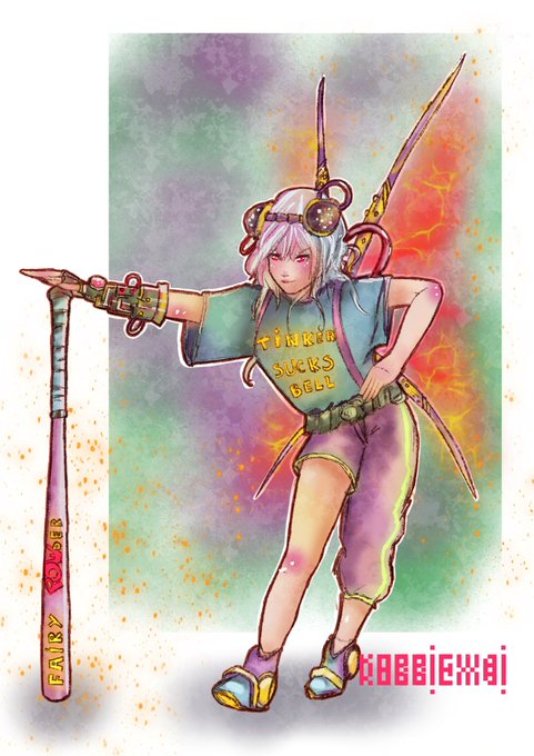 @inktober last week is coming and today’s theme is #fairy . I went #cyberpunk and #pastel . #art #characterdesign #tinkerbell #baseballbat #badass #inktober2022