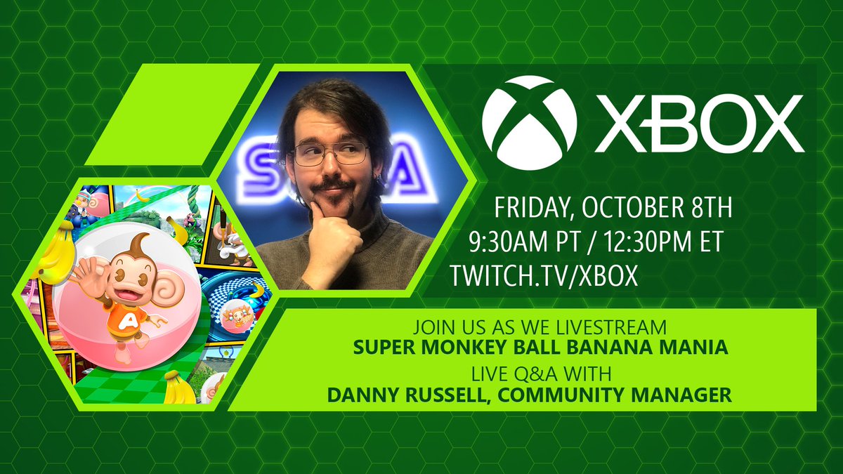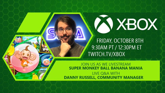Join us on Friday October 8th for the @Xbox Twitch livestream, where we'll be chatting about everything Super Monkey Ball Banana Mania has to offer! #SuperMonkeyBall #BananaMania