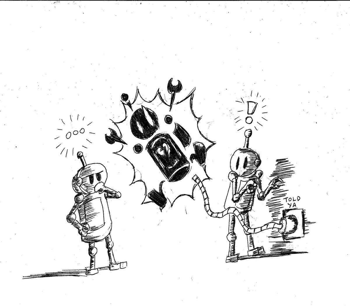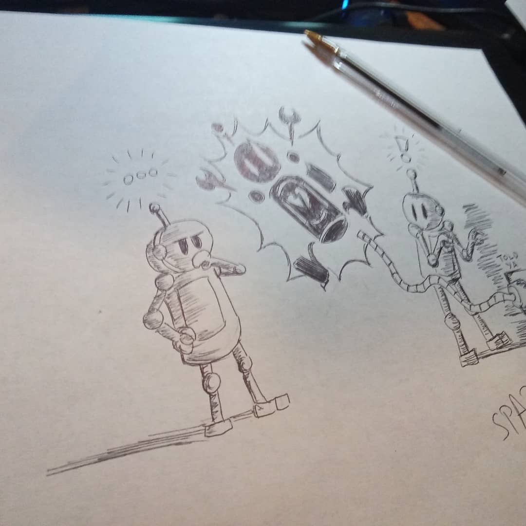 Inktober 2021 day 27: spark (2/2) #inktober #inktober2021 #spark #sketch #illustration #traditionalart #blackandwhite #robot #battery #broken #zapp #shock