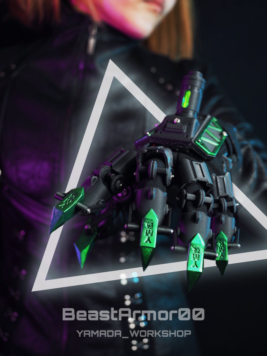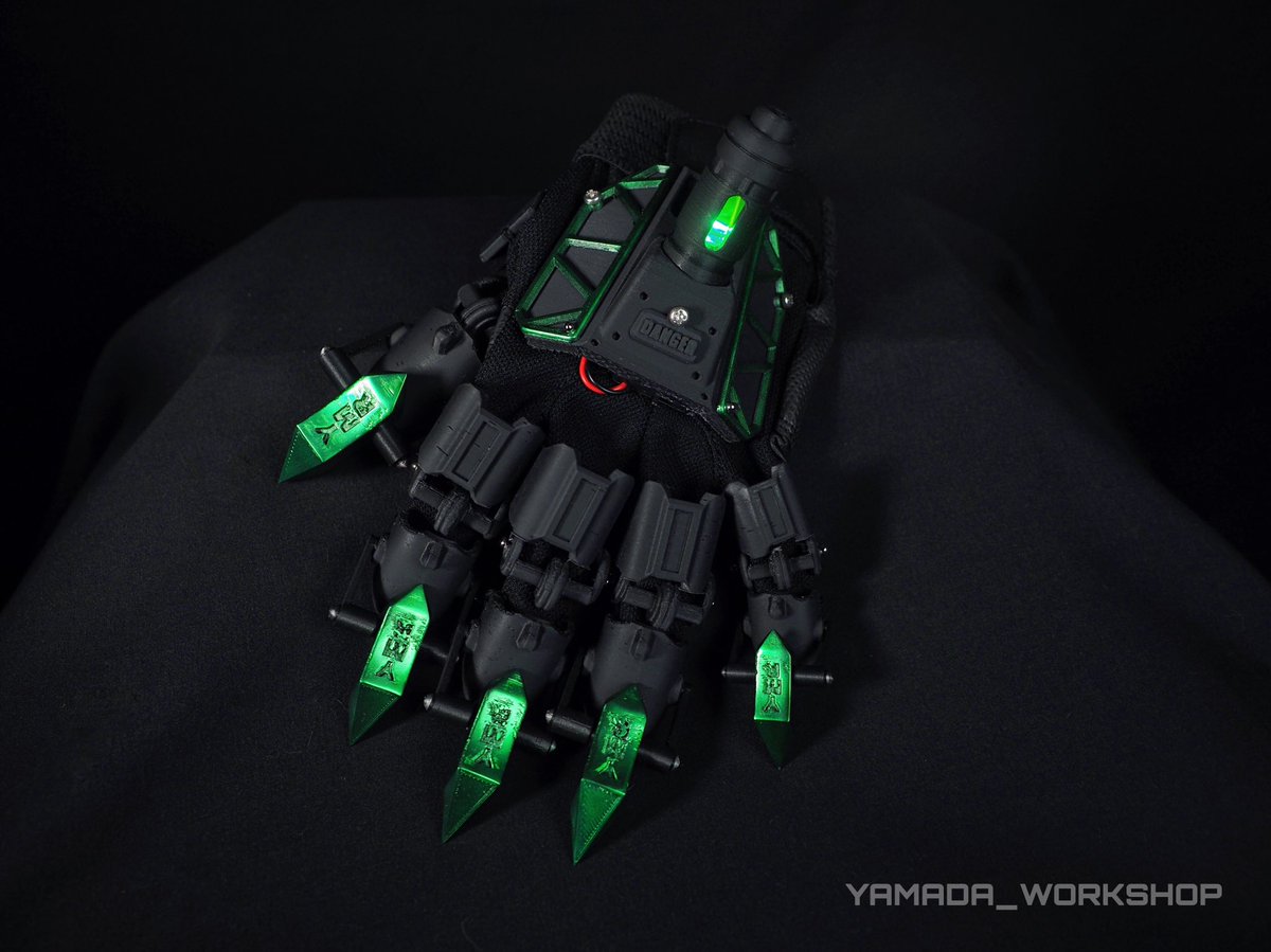 "Beast Within" -内なる獣- セミオーダー完成報告 --黒と緑の漆黒に輝く宝石義手-- 塗装オプションで爪、手の甲の部分を緑に塗装させていただきました。 光は緑に輝きます。 艶のない黒は闇度が高くてかっこよくなりました。 #YMR社創作 #BeastArmor00