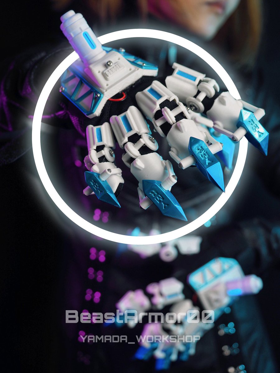 "Beast Within" -内なる獣- セミオーダー完成報告 --白と青の冷たさを放つ義手-- 塗装オプションで爪、手の甲の部分を青のメタリックに塗装させていただきました。 前回の義手とはまた違うごつくてかっこいいものに仕上がりました。 #YMR社創作 #BeastArmor00