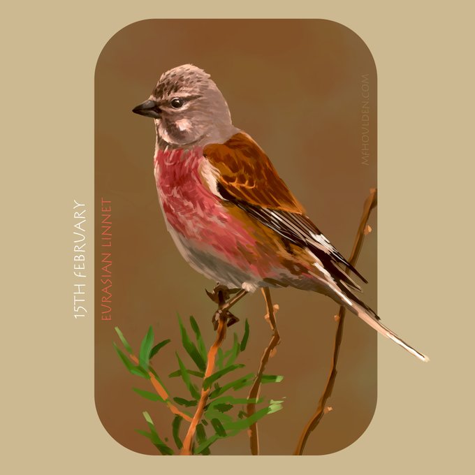 Day 46 2023 ~ February 15th ~ Eurasian Linnet - This one was a toughie! Sometimes totally side on birds are tough to give a proper sense of form. Pretty bird though! #art #noai #humanartist #digitalart #birds #birdtwitter #cute #linnet #biodiversity #birdillustration #natureart