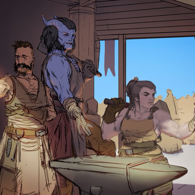Forge Saints! - Working on a series of illustrations on my Patreon. Link in bio #dungeonsanddragons #coverart #illustration #fantasyart #coloring #paintingprocess #blacksmith #coloringtutorial #digitalart #dndart #dnd #svilland #campaignsetting #blacksmithdwarf #tiefling #dwarf