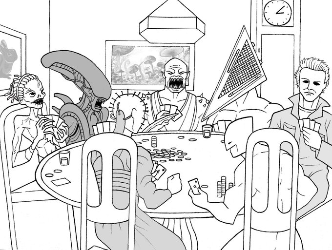 Couldn't think of anything to draw for the prompt "bluff". So instead, here's an older drawing I did for @BarakaLuvr, featuring a bunch of their favs playing some poker. #inktober #inktober2022 #bluff