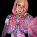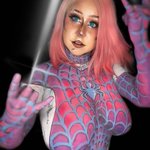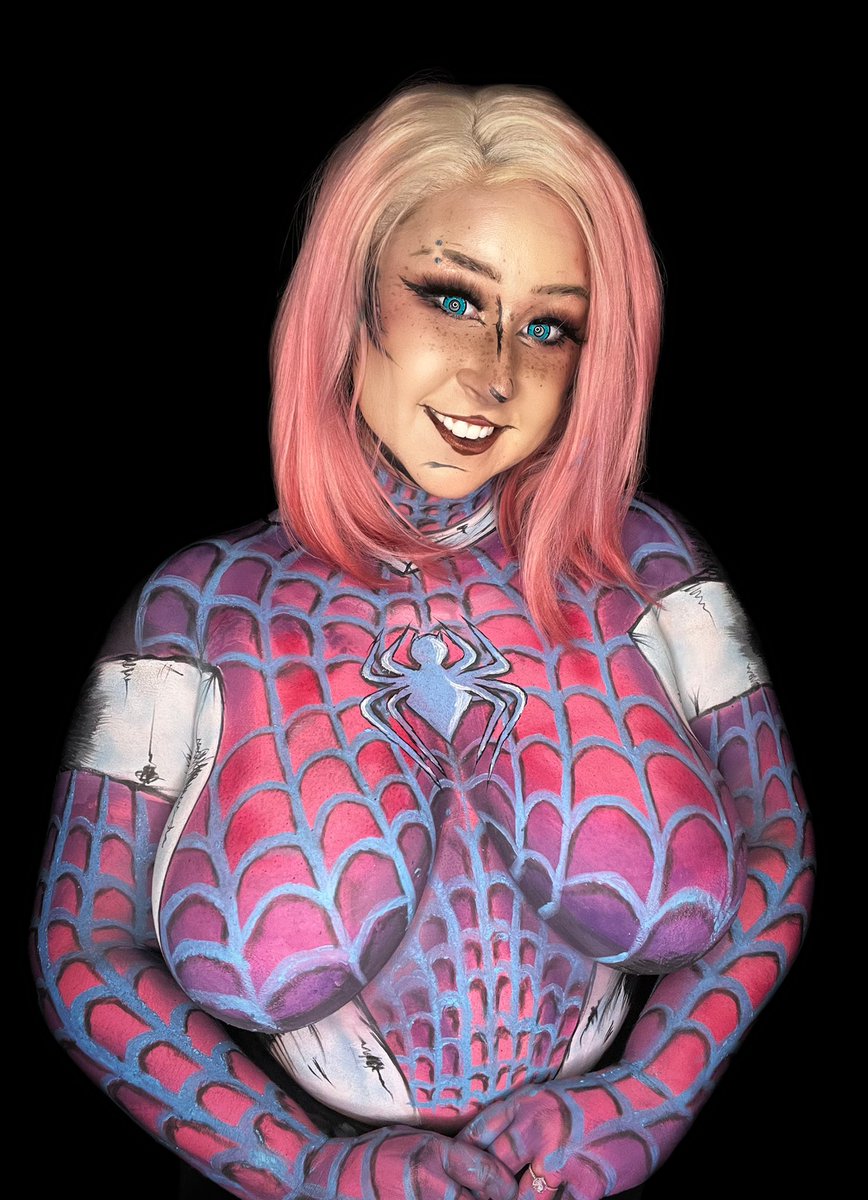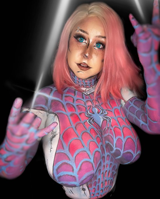 Spider-Gwen bodypaint! Done live on twitch.tv/yanderestrasza 11 hours of painting got me some of my best work I’ve ever done. Thanks chat for pushing me through and hyping me up the whole time 💕 #spidergwen #bodypaint #cosplay