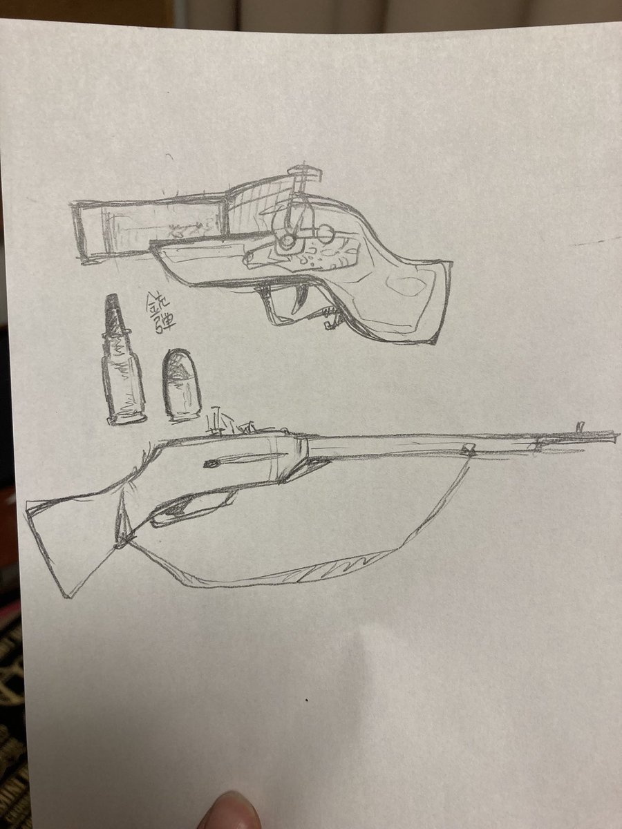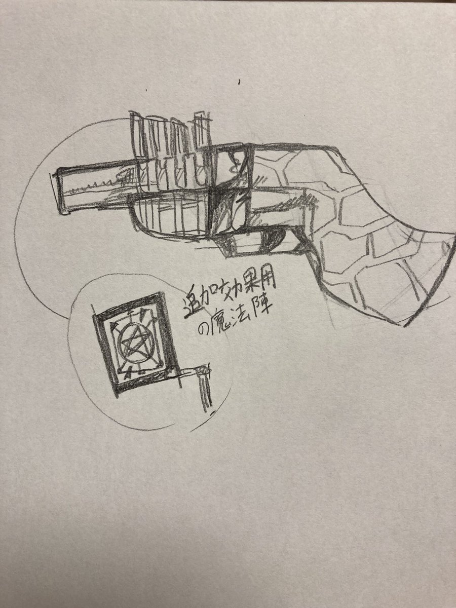 #Bradós_inkshop 再び世界観設定垂れ流し(落書き) ←非魔族が使用する科学の兵器:銃 →射程距離の長い銃に対抗するために魔族が作った魔具の銃 科学の方はもちろん実弾使用なのに対して魔具の方は魔力を溜めて遠くに飛ばす道具