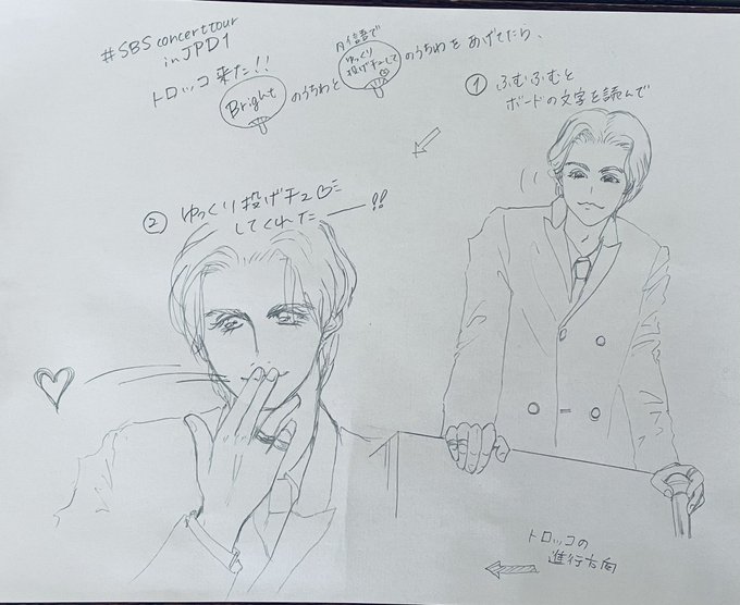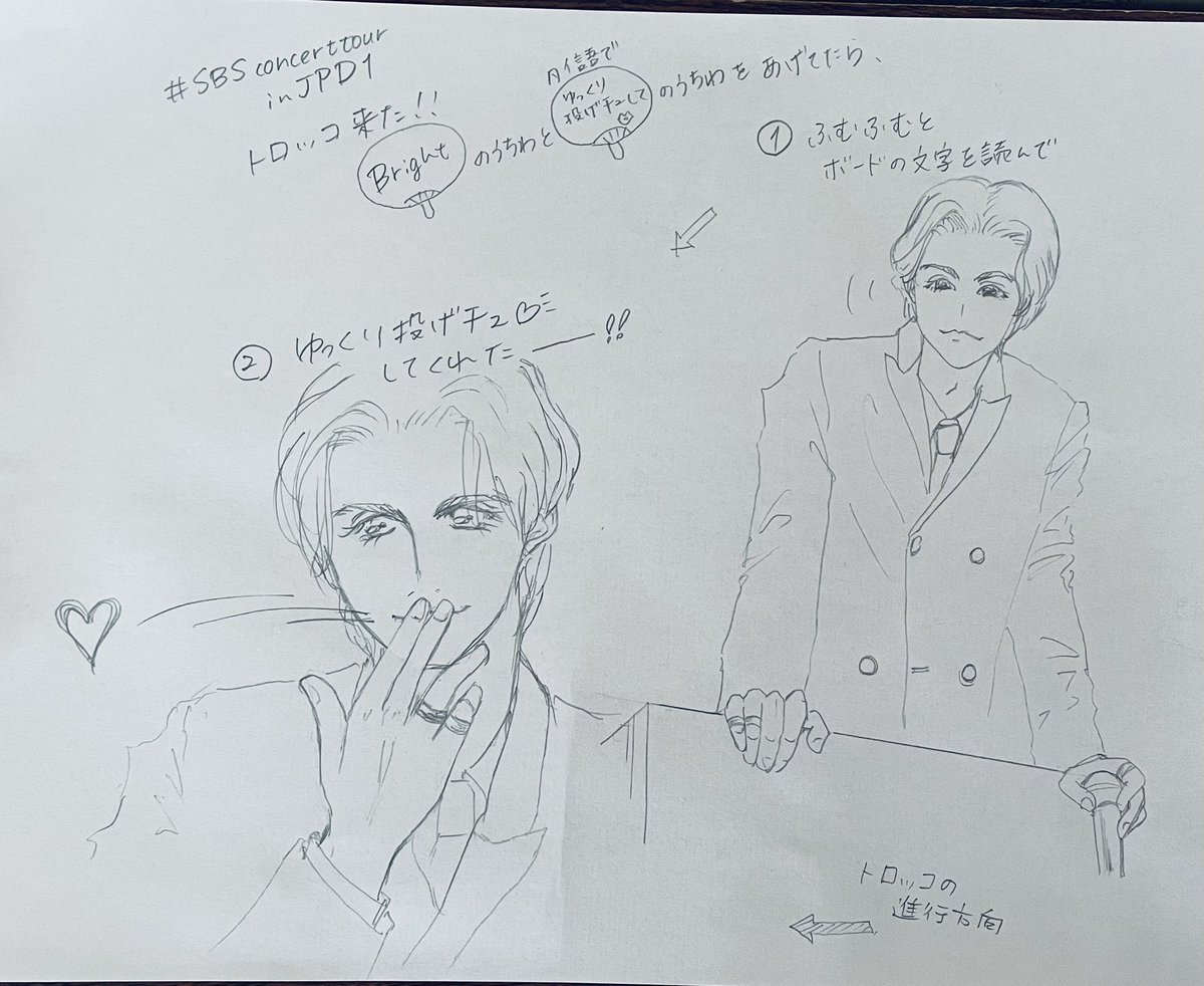トロッコくんのおかげでBrightくんが投げチュ💋くれた〜〜😭💖💘💓💞 私のスマホは首から下しか撮れて無かったから忘れないうちにお絵描きした! この思い出を牛のように反芻したい🐄❤️ #BrightWinSBSTour2023inJP #SBSconcerttourinJPD1