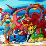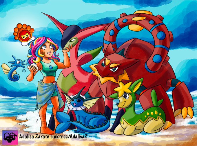 #Fanartsunday and this is a half fanart, half original characters, because I just had to give the characters of my webcomic #Buildingblocks their own #pokemonteam, and in this case, it's Hine, the spirit of #summer. She has a team mostly of water and fire pokemon, and a Deerling.