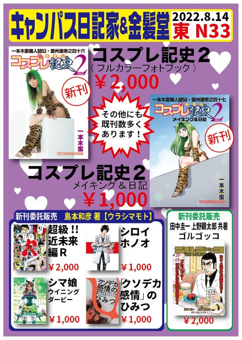 #C100 #c100カウントダウン #C100新刊 金髪堂・キャンパス日記家のうちは日曜2日め東N33、土曜1日め東A30のウラシマモトと新刊相互委託しています‼せひぜひ対策してお運びください♥ #c100お品書き ゴルゴ本もあるよ‼ twitter.com/bang_ipp/statu…