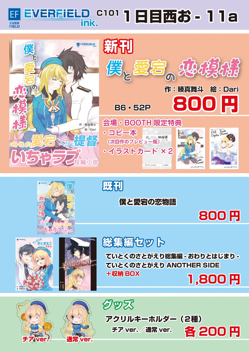 差し迫ってきたのでおしながき等再掲です。 新刊は艦これの愛宕×提督のラブコメ短編小説です。単品800円で、会場・BOOTH特典としてイラストカード2枚とコピー本(次回作のプレビュー版)をおつけします。 1日目西お-11a「EVERFIELD ink.」にてお待ちしています! #C101 #C101おしながき #C101お品書き