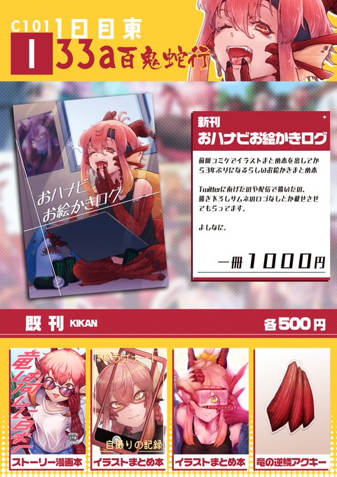【#C101おしながき 】#竜乃ハナビ ┤新刊├ ¥1000 ・3年ぶりのイラストまとめフルカラー本 ┤既刊├ ¥500 ・バーチャルにきた生い立ちのマンガ家モノクロ本 ・イラストまとめ本2冊 ・剥がれ落ちた逆鱗のアクリルキーホルダー 一日目東ホール I-33a にてお待ちしております。