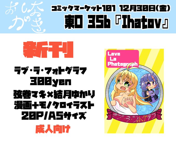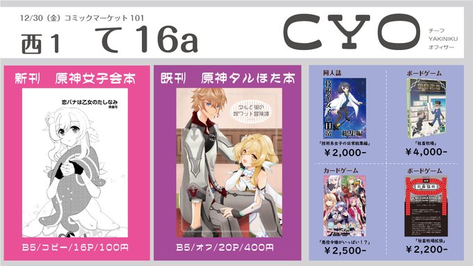 コミケ近づいてきましたね。おしながき公開です 全ての頒布作品が全年齢向けとなっています コミケWebカタログでも配置場所等ご確認いただけます~是非どうぞwebcatalog.circle.ms/Circle/Map/168… #C101WebCatalog #C101おしながき #C101