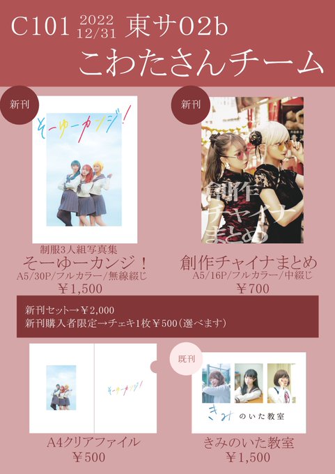 C101お品書きです!vol.7のみ2500円であとは各2000円です!全巻40p 素敵なモデルさんのお写真沢山あるので見るだけでも来てくれたら嬉しいです♥️🙏 当日はさくらこちゃんとれんちゃんがお待ちしております! #C101 #C101告知 #C101おしながき