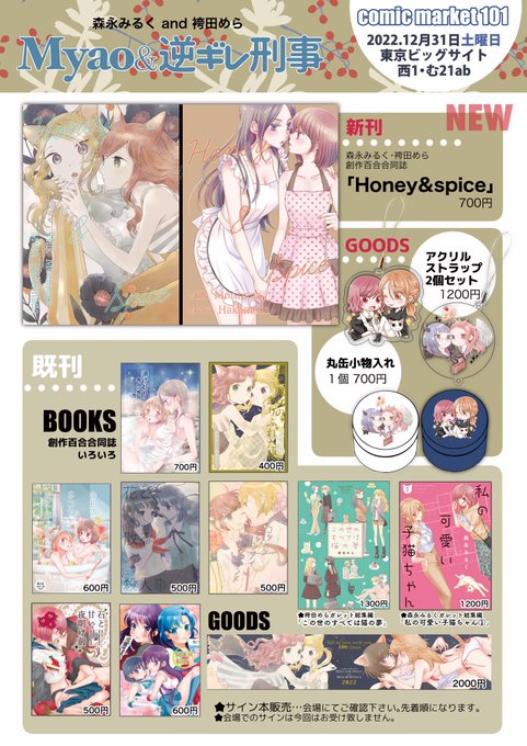 【冬コミお品書き】 明日なのでもう一度… 明日12月31日土曜日、コミックマーケット101参加します。 新刊は袴田めらさんとの創作百合合同誌とグッズがあります。 合同スペース合同会計です。 サイン本も作ったので持っていきます☺️ 宜しくお願いします〜! カイロも忘れずに! #C101 #C101おしながき